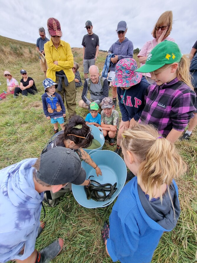 The exploration continued to Lake Braemore, an artificially constructed lake on Braemore Farm. Initially created for irrigation, the lake now holds a broader community vision as a potential local camping and jet boating spot. Although it is artificially constructed, the lake is teeming with life. Our nets were bursting with 14 shortfin eels, much to the excitement of all the tamariki.